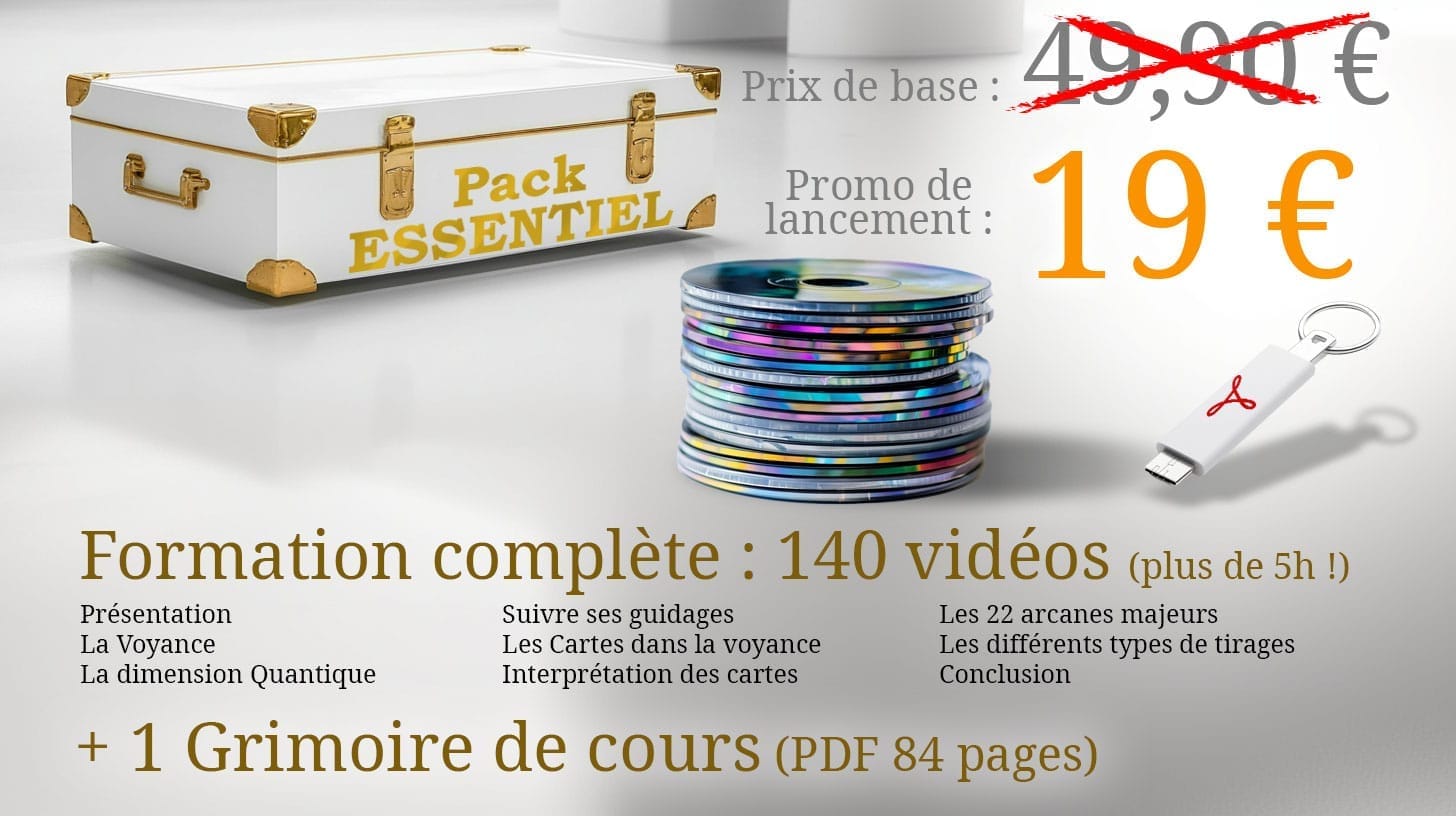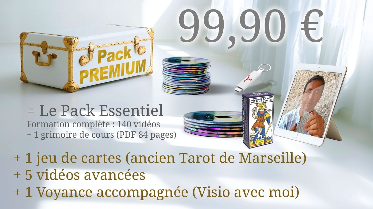 L'enseignement de base sera le même, mais des éléments supplémentaires seront proposés, comme 5 vidéos exclusives, un jeu de Tarots, un manuel imprimé, ou les 30 minutes de voyance accompagnée, où je vous assisterai en visio lors d'un tirage que vous allez effectuer une fois votre parcours finalisé.